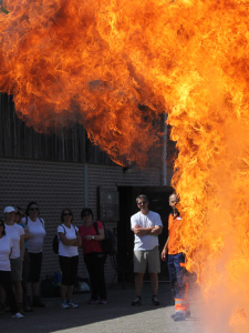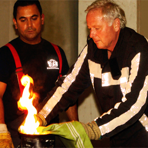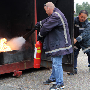 Geen theorie les, maar direct zelf oefenen. Doof de vlam in de pan met een theedoek. Pak een brandblusser en spuit een schuimdeken. Alles onder begeleiding van professionele brandweermannen.