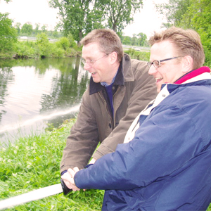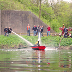 We beginnen meteen met actie. Bij aankomst stapt de vrijgezel meteen in het huwelijksbootje, letterlijk wel te verstaan! Hij roeit in zijn eentje tot de bocht, daar staan wij hem op te wachten: met de brandslang uiteraard!