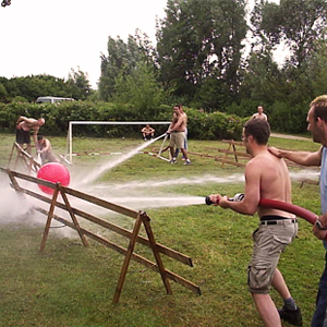 Doelpunt ! ! ! Voetballen op de brandweer-manier?! Dan komt er zeker veel water aan te pas? Inderdaad! De bal is niet aan de voet maar speelt u met de waterstraal! De ‘tackle’ doet geen zeer maar is wel erg nat…!